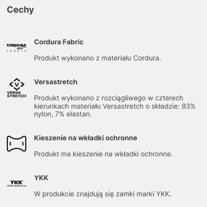 W kluczowych miejscach (pas, krocze i tył kolan) zastosowano wstawki z rozciągliwego materiału Versastretch. Jego największą zaletą jest szybkie schnięcie i wysoka oddychalność.